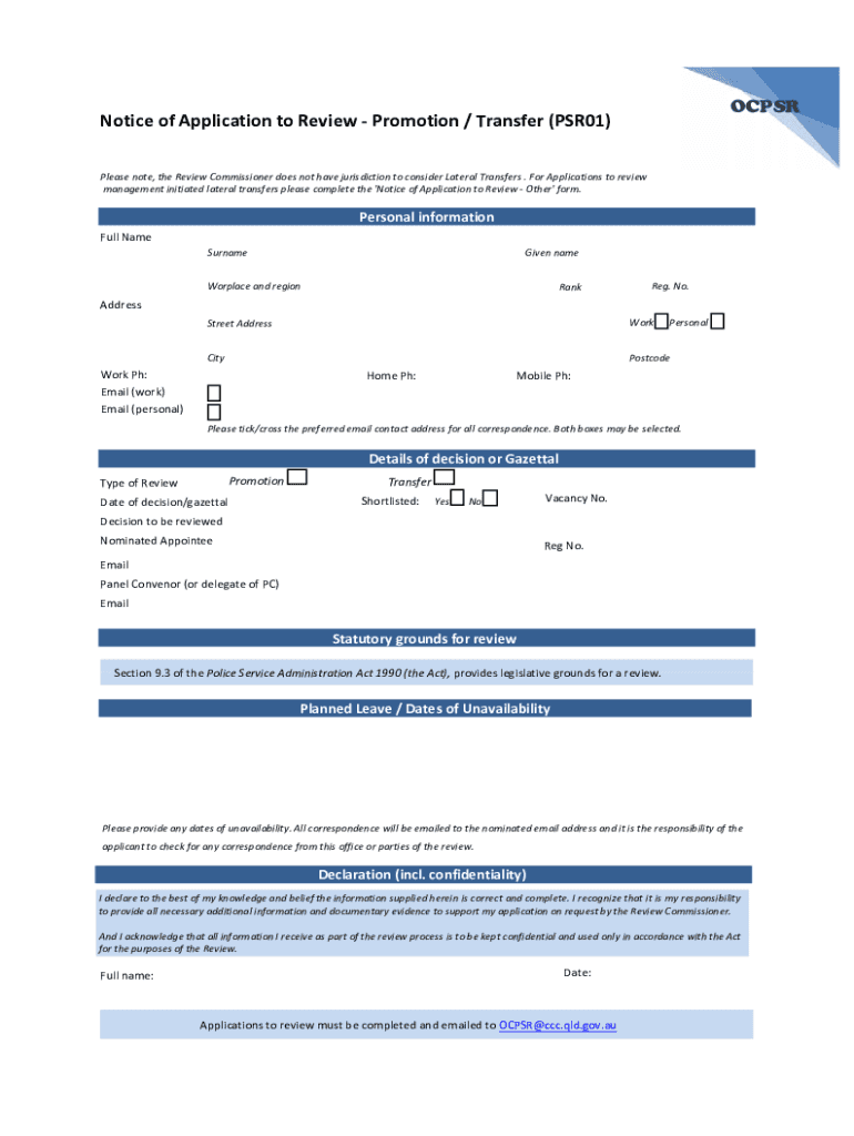 OCPSRNoticeofApplicationtoReview Promotion / Transfer (PSR01) Please note, prereview Commissioner doesnothave jurisdiction to considerLateralTransfers. For Applications to review managementinitiatedlateral