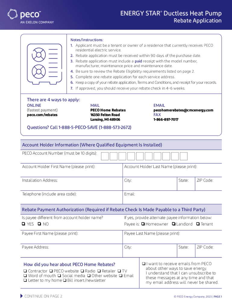 ENERGY STAR Ductless Heat Pump Rebate ApplicationNotes/Instructions: 1. Applicant must be a tenant or owner of a residence that currently receives PESO residential electric service. 2. Rebate application