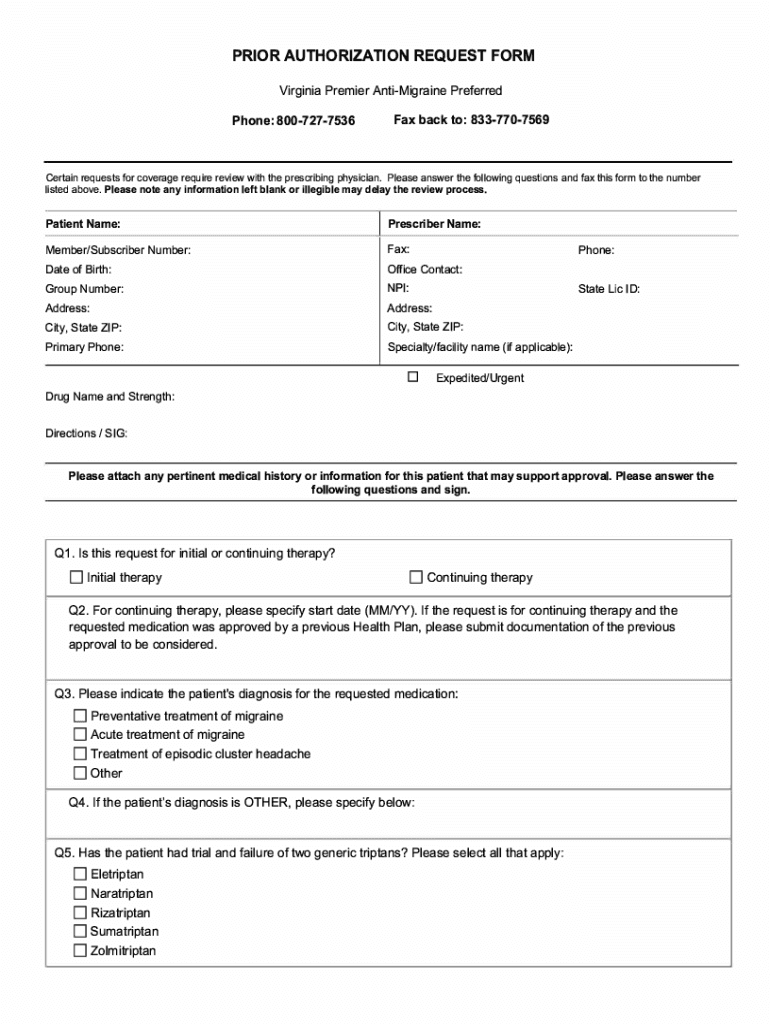 PRIOR AUTHORIZATION REQUEST FORM Virginia Premier AntiMigraine Preferred Phone: 8007277536Fax back to: 8337707569Certain requests for coverage require review with the prescribing physician. Please