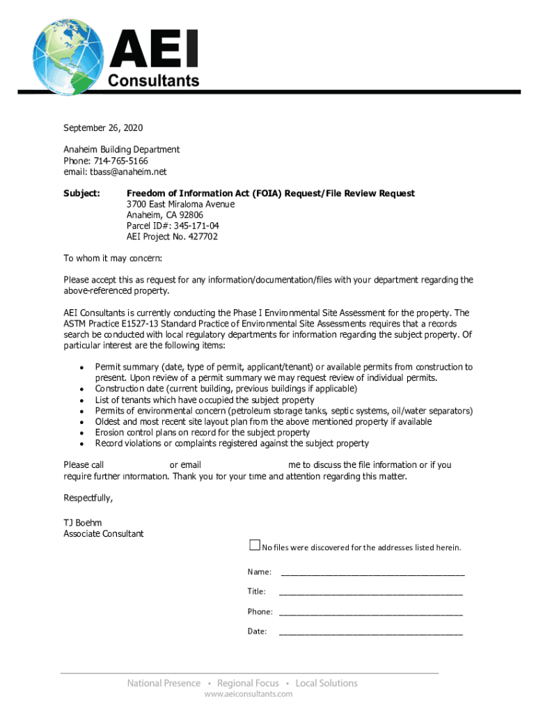 September 26, 2020, Anaheim Building Department Phone: 7147655166 email: tbass@anaheim.net Subject:Freedom of Information Act (FOIA) Request/File Review Request 3700 East Diploma Avenue Anaheim, CA