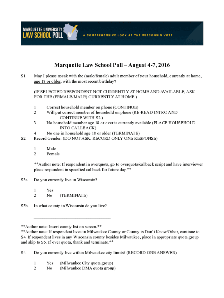 Marquette Law School Poll August 47, 2016 S1. May I please speak with the (male/female) adult member of your household, currently at home, age 18 or older, with the most recent birthday? (IF SELECTED