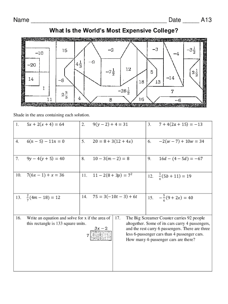 Name ___ Date ___ A13 What Is the Worlds Most Expensive College? Shade in the area containing each solution. 1.5 + 2(+ 4) 642.9(2) + 4 313.7 + 4(2 + 15) 134.6(5) 11 05.20 8 + 3(12 + 4)6.2(7) + 10