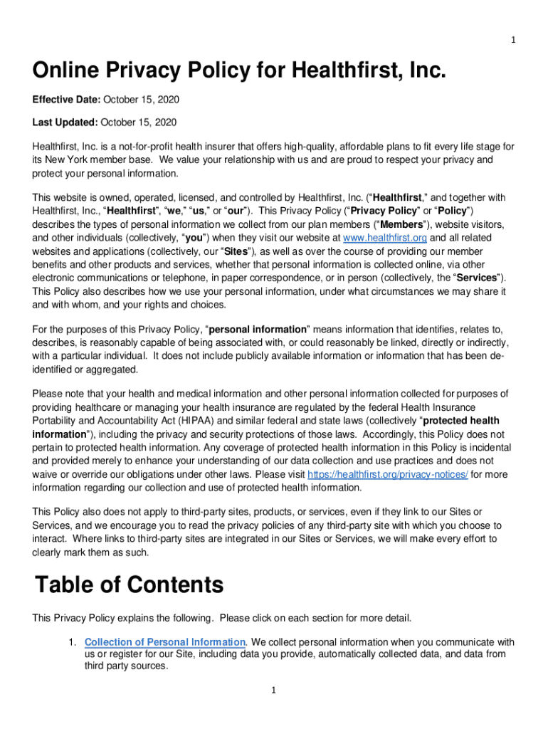 1Online Privacy Policy for Health first, Inc. Effective Date: October 15, 2020, Last Updated: October 15, 2020, Health first, Inc. is a notforprofit health insurer that offers high quality, affordable