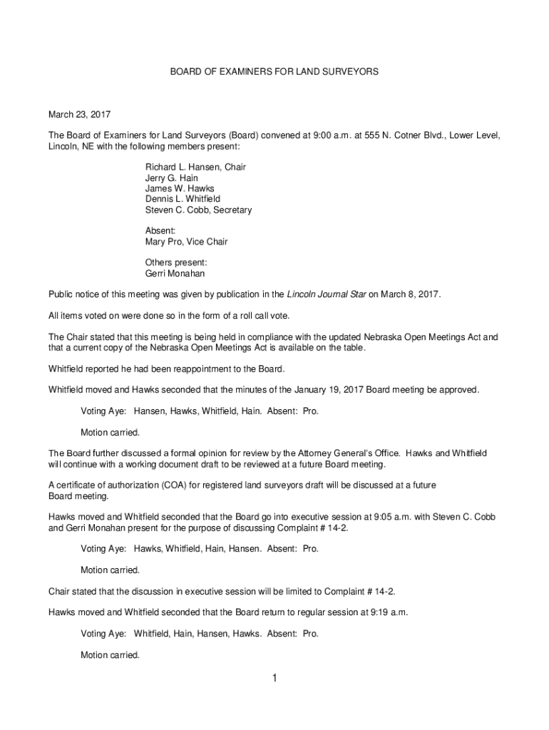 BOARD OF EXAMINERS FOR LAND SURVEYORS March 23, 2017, The Board of Examiners for Land Surveyors (Board) convened at 9:00 a.m. at 555 N. Corner Blvd., Lower Level, Lincoln, NE with the following members