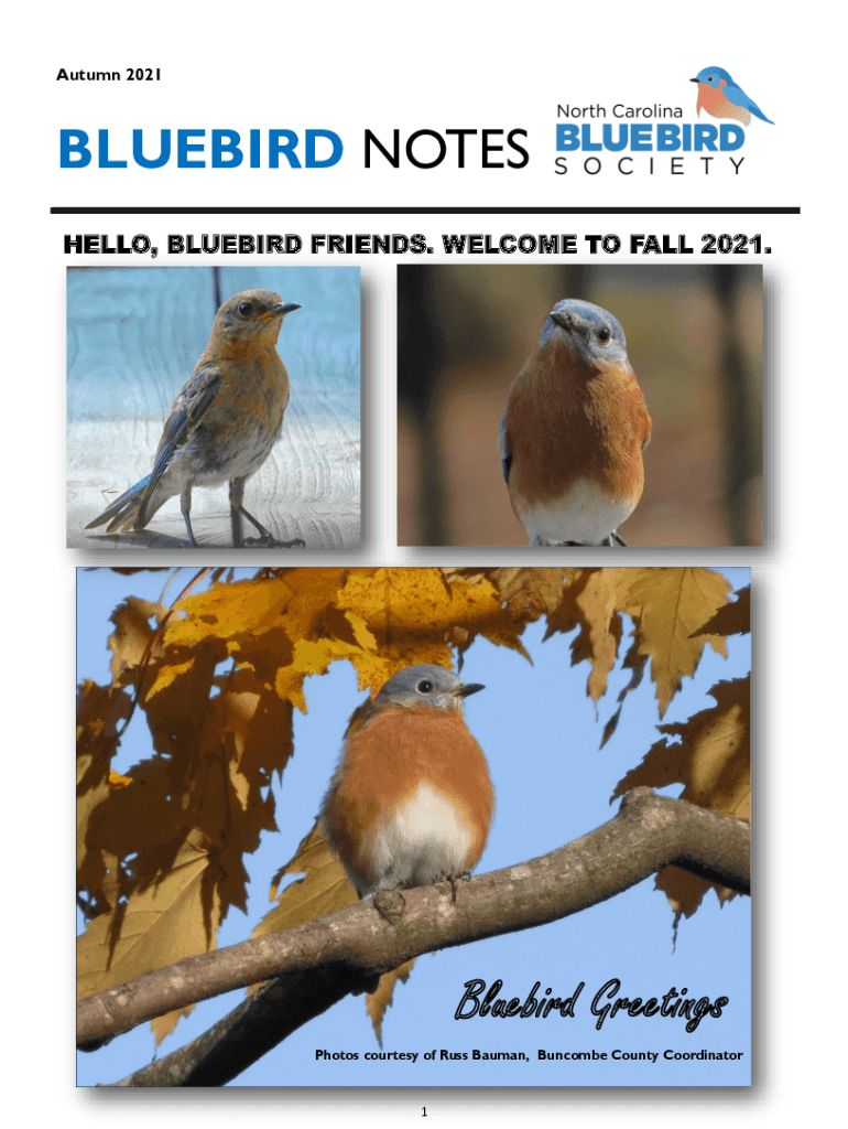Autumn 2021BLUEBIRD NOTES HELLO, BLUEBIRD FRIENDS. WELCOME TO FALL 2021. Glenda RyanBluebird Greetings Photos courtesy of Russ Batman, Buncombe County Coordinator1North Carolina Bluebird Society (NBS)