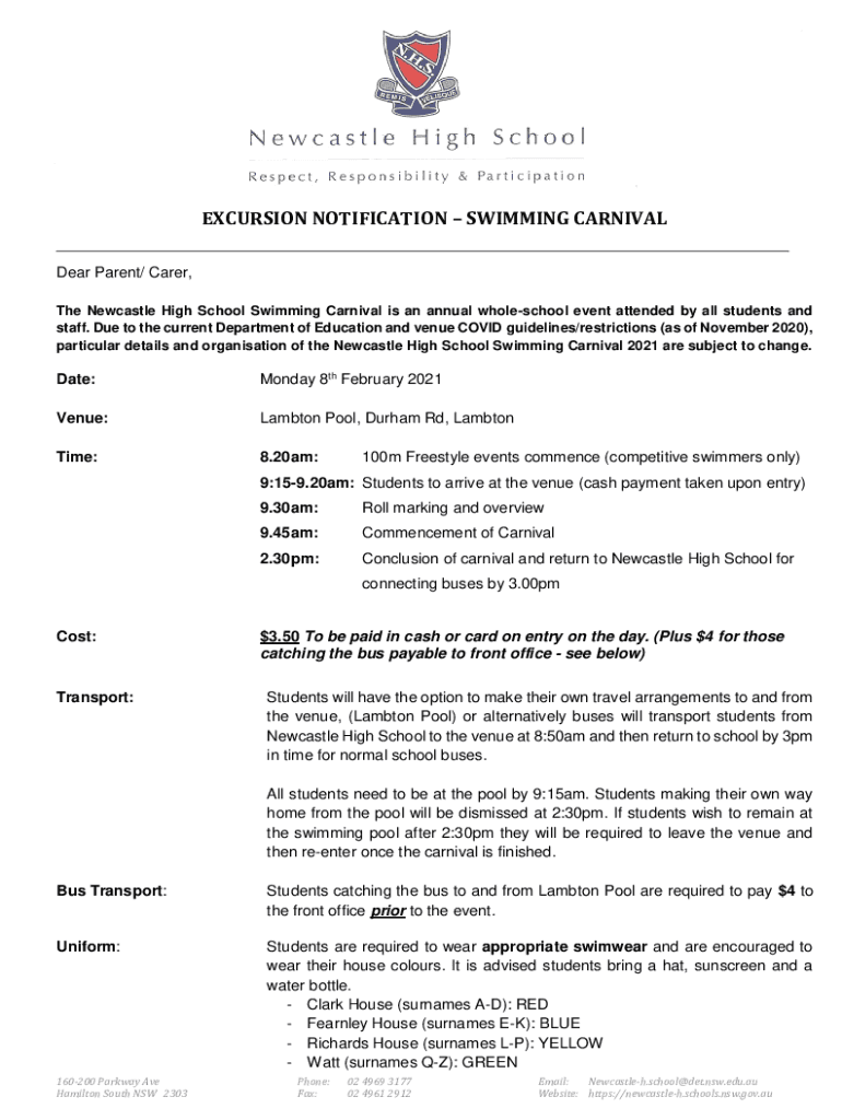EXCURSION NOTIFICATION SWIMMING CARNIVAL Dear Parent/ Carer, The Newcastle High School Swimming Carnival is an annual whole school event attended by all students and staff. Due to the current Department