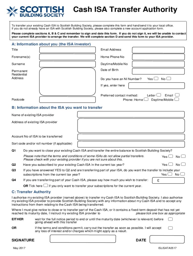 Cash ISA Transfer Authority To transfer your existing Cash ISA to Scottish Building Society, please complete this form and hand/send it to your local office. If you do not already have an ISA with