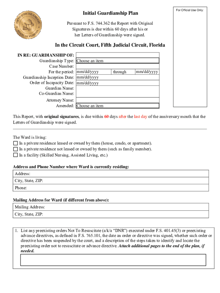 Initial Guardianship Platform Official Use Only:Pursuant to F.S. 744.362 the Report with Original Signatures is due within 60 days after his or her Letters of Guardianship were signed. In the Circuit