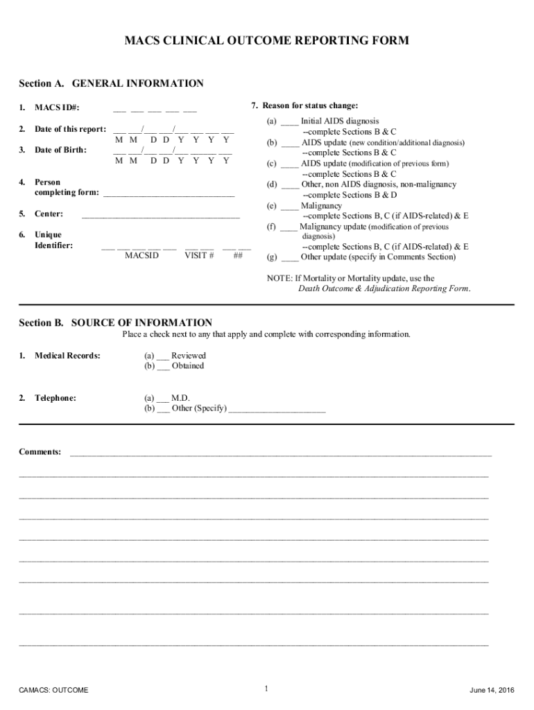 MACS CLINICAL OUTCOME REPORTING Formation A. GENERAL INFORMATION ___ ___ ___ ___ ___1.MACS ID#:2. Date of this report: ___ ___/___ ___/___ ___ ___ ___ M D D Y Y Y Y Date of Birth: ___ ___/___ ___/___