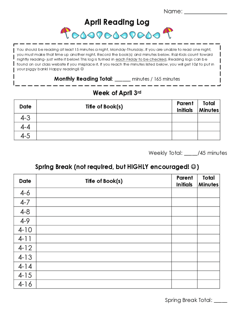 Name: ___April Reading Logo should be reading at least 15 minutes a night, Monday Thursday. If you are unable to read one night, you must make that time up another night. Record the book(s) and minutes
