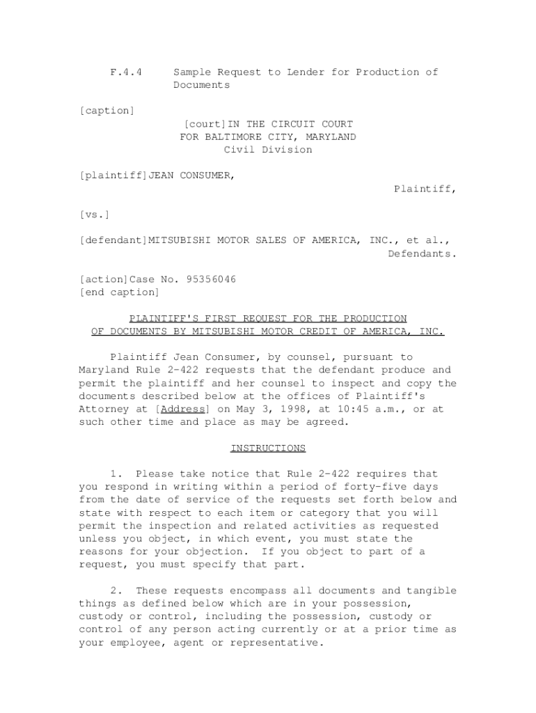 F.4.4Sample Request to Lender for Production of Documents[caption] [court]IN THE CIRCUIT COURT FOR BALTIMORE CITY, MARYLAND Civil Division [plaintiff]JEAN CONSUMER, Plaintiff, [vs.] [defendant]MITSUBISHI