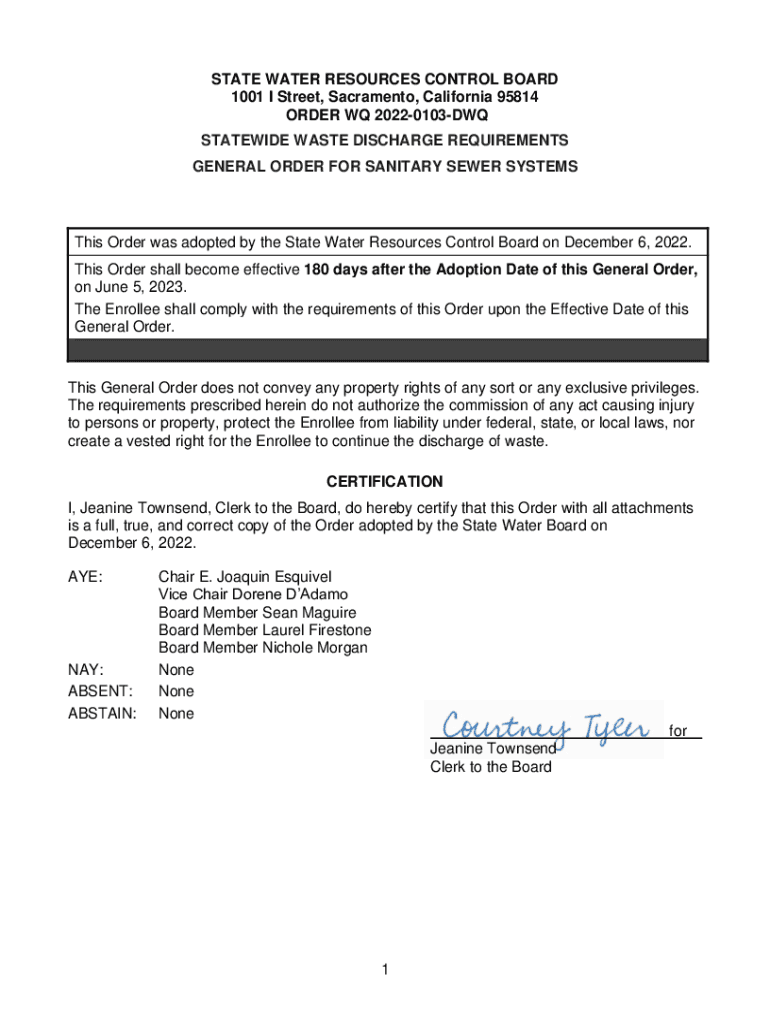 STATE WATER RESOURCES CONTROL BOARD 1001 I Street, Sacramento, California 95814 ORDER WE 20220103DWQ STATEWIDE WASTE DISCHARGE REQUIREMENTS GENERAL ORDER FOR SANITARY SEWER Systematic Order was adopted