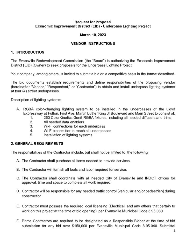 Request for Proposal Economic Improvement District (EID) Underpass Lighting Project March 10, 2023, VENDOR INSTRUCTIONS 1. INTRODUCTION The Evansville Redevelopment Commission (the Board) is authorizing