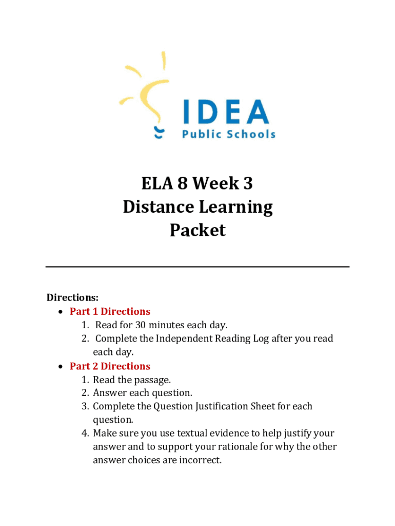 ELA 8 Week 3 Distance Learning PacketDirections: Part 1 Directions 1. Read for 30 minutes each day. 2. Complete the Independent Reading Log after you read each day. Part 2 Directions 1. Read the passage.