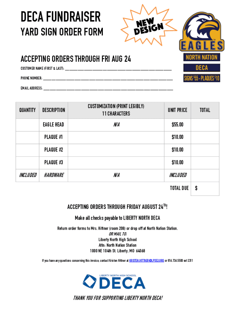 DECA FUNDRAISERNEWGN DEERYARD SIGN ORDER FORM ACCEPTING ORDERS THROUGH FRI AUG 24CUSTOMER NAME (FIRST & LAST): ___ PHONE NUMBER: ___ EMAIL ADDRESS: ___QUANTITYINCLUDEDDESCRIPTIONCUSTOMIZATION (PRINT