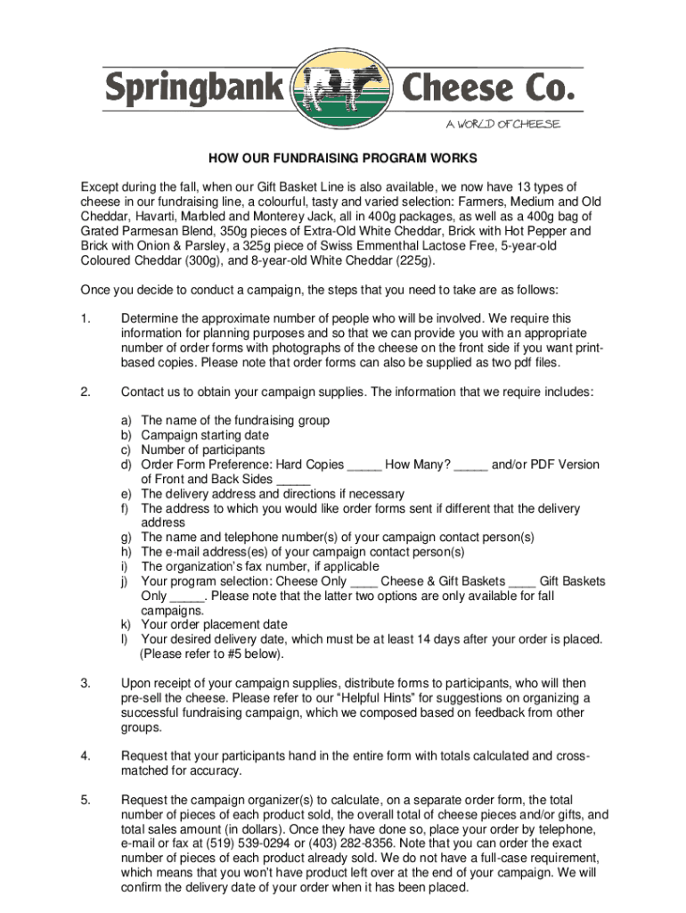 HOW OUR FUNDRAISING PROGRAM WORKS Except during the fall, when our Gift Basket Line is also available, we now have 13 types of cheese in our fundraising line, a colorful, tasty and varied selection:
