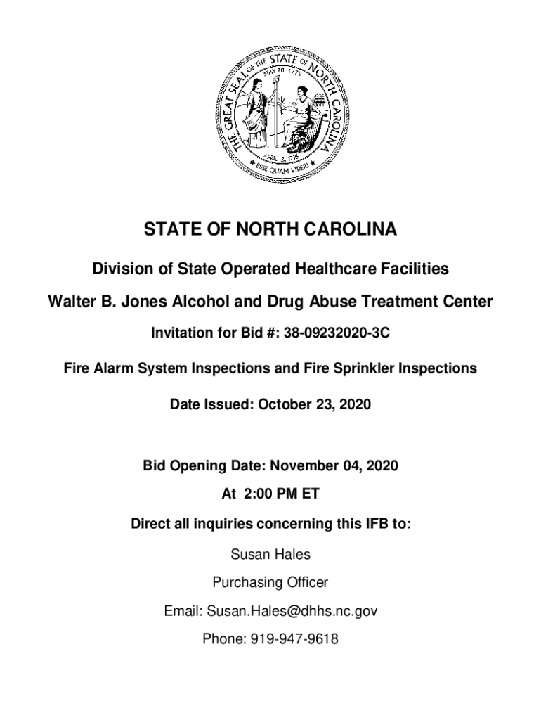 STATE OF NORTH CAROLINA Division of State Operated Healthcare Facilities Walter B. Jones Alcohol and Drug Abuse Treatment Center Invitation for Bid #: 38092320203C Fire Alarm System Inspections and