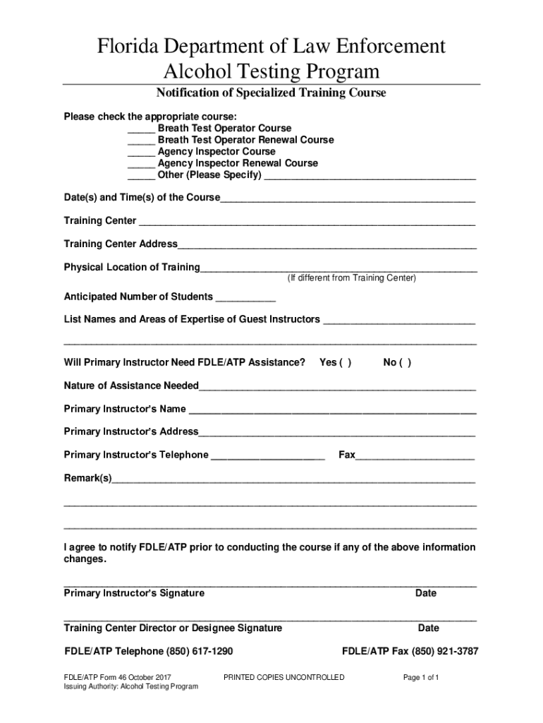 Florida Department of Law Enforcement Alcohol Testing Program Notification of Specialized Training Course Please check the appropriate course: ___ Breath Test Operator Course ___ Breath Test Operator