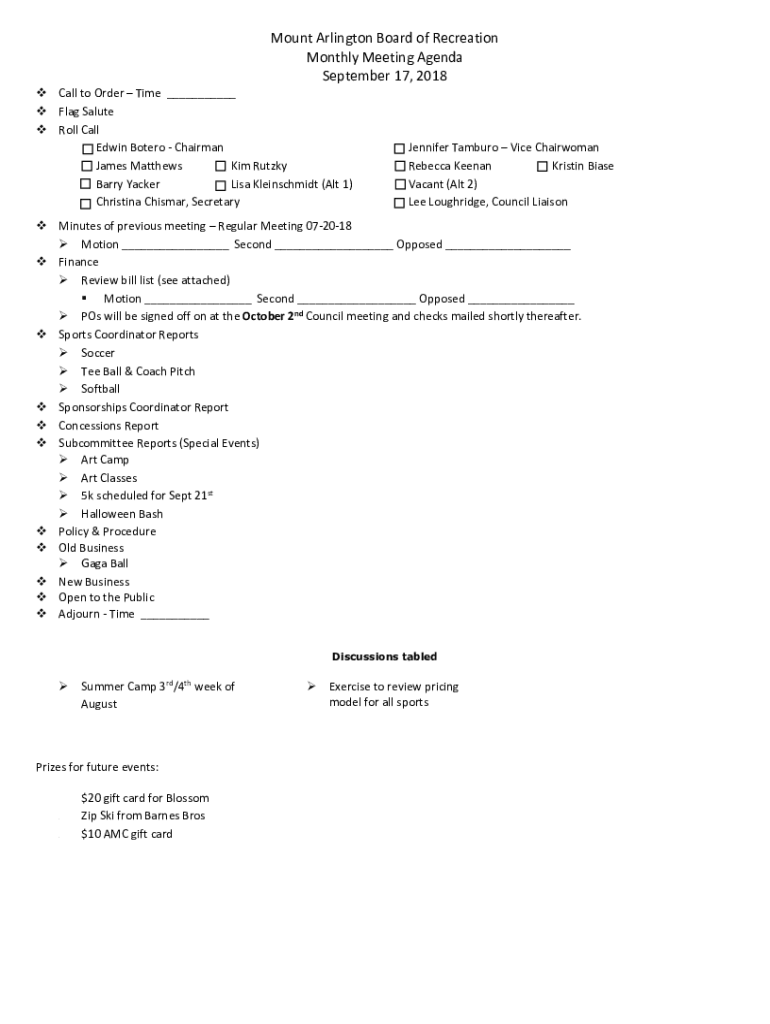 Mount Arlington Board of Recreation Monthly Meeting Agenda September 17, 2018, Call to Order Time ___ Flag Salute Roll Call Edwin Bolero Chairman James Matthews Kim Gretzky Barry Hacker Lisa Kleinschmidt