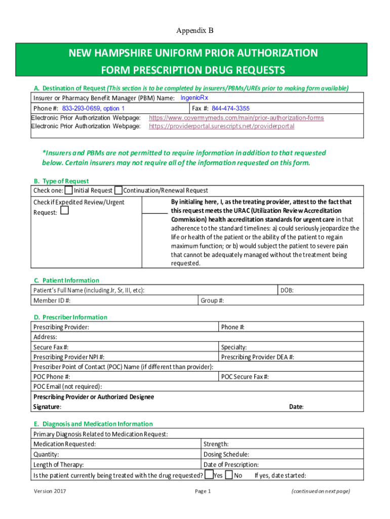 Appendix NEW HAMPSHIRE UNIFORM PRIOR AUTHORIZATION FORM PRESCRIPTION DRUG REQUESTS A. Destination of Request (This section is to be completed by insurers/BMS/Uses prior to making form available) Insurer