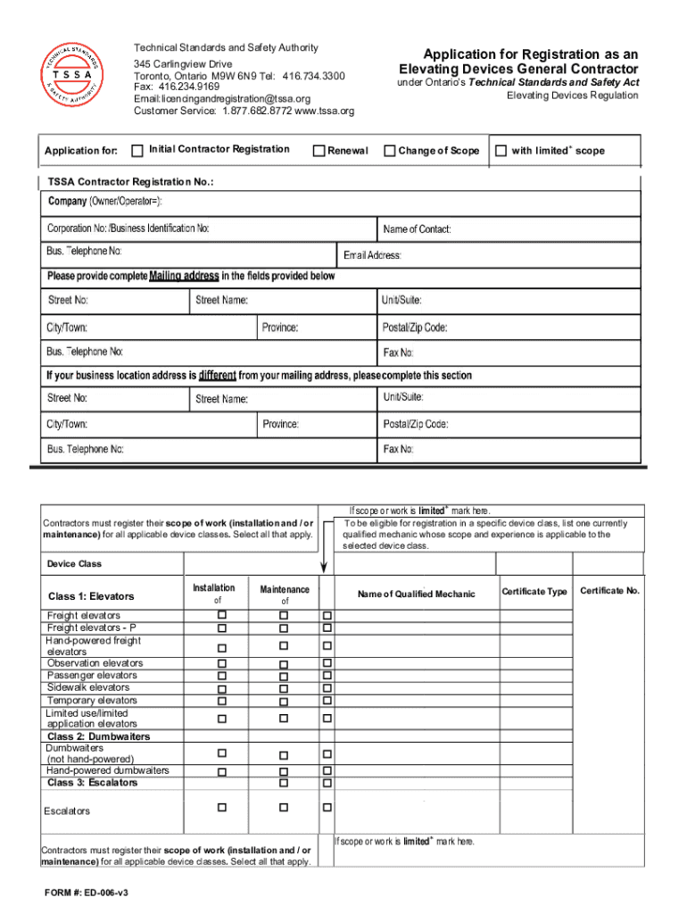 January 31, 2023Renewal: 2023 2024 Dear Elevating Device Contractor, The Technical Standards and Safety Authority (SSA) is pleased to provide you with this information package to assist you with the
