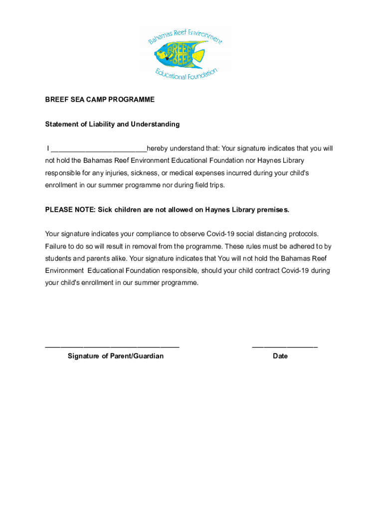 BRIEF SEA CAMP Program Statement of Liability and Understanding I ___hereby understand that: Your signature indicates that you will not hold the Bahamas Reef Environment Educational Foundation nor