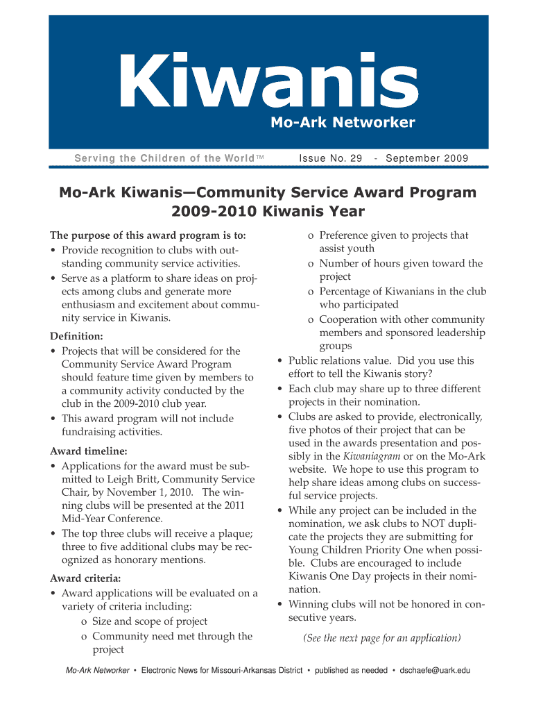 Kiwanis Mo-Ark Networker Serving the Children of the World Issue No. 29 September 2009 Mo-Ark Kiwanis Community Service Award Program 2009-2010 Kiwanis Year The purpose of this award program is to: