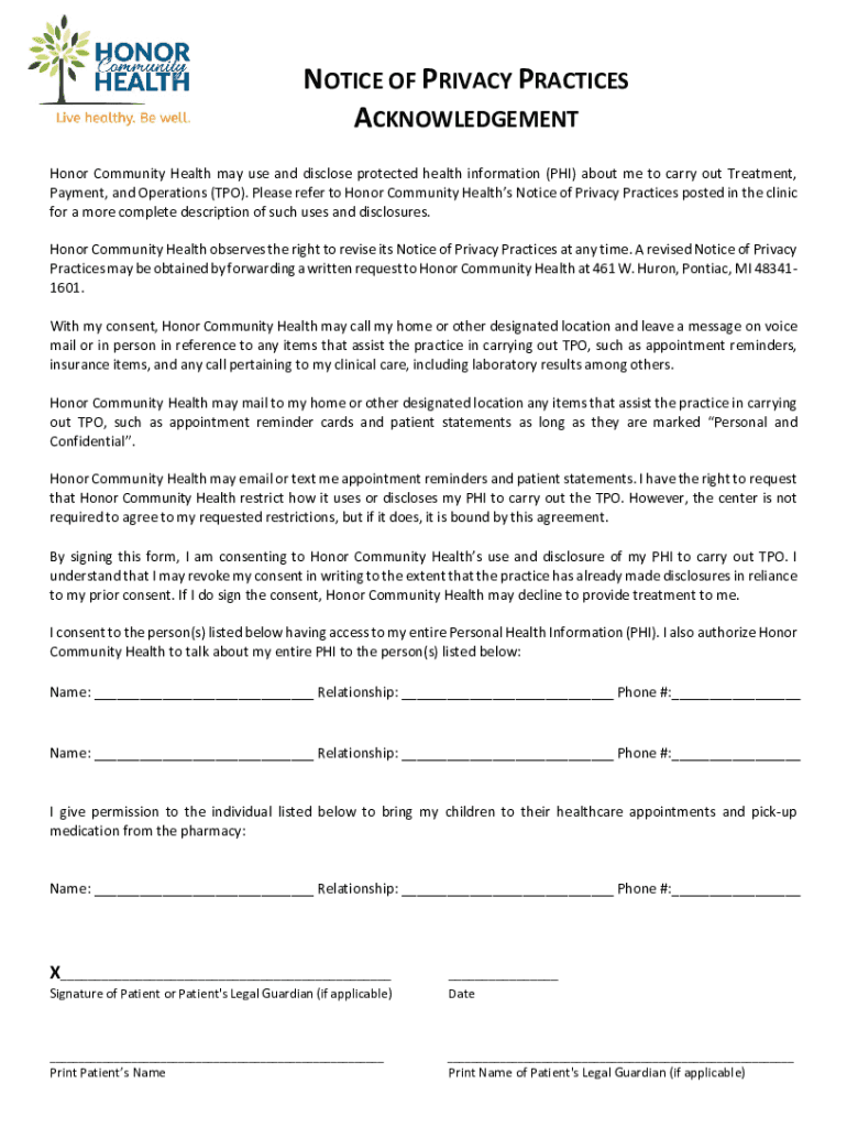 NOTICE OF PRIVACY PRACTICES ACKNOWLEDGEMENT Honor Community Health may use and disclose protected health information (PHI) about me to carry out Treatment, Payment, and Operations (TPO). Please refer