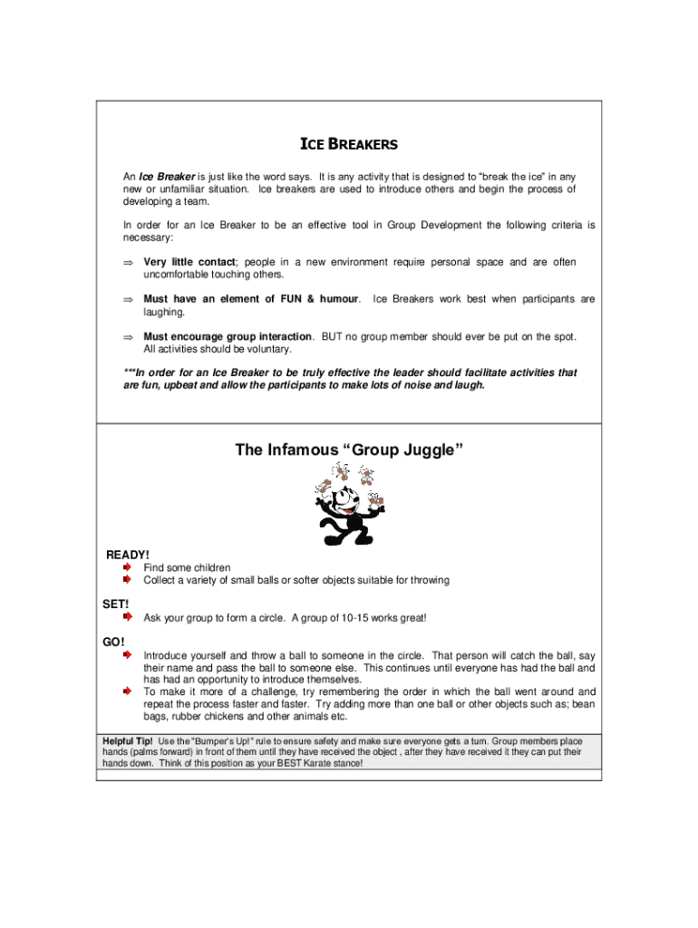Icebreakers An Ice Breaker is just like the word says. It is any activity that is designed to break the ice in any new or unfamiliar situation. Icebreakers are used to introduce others and begin the