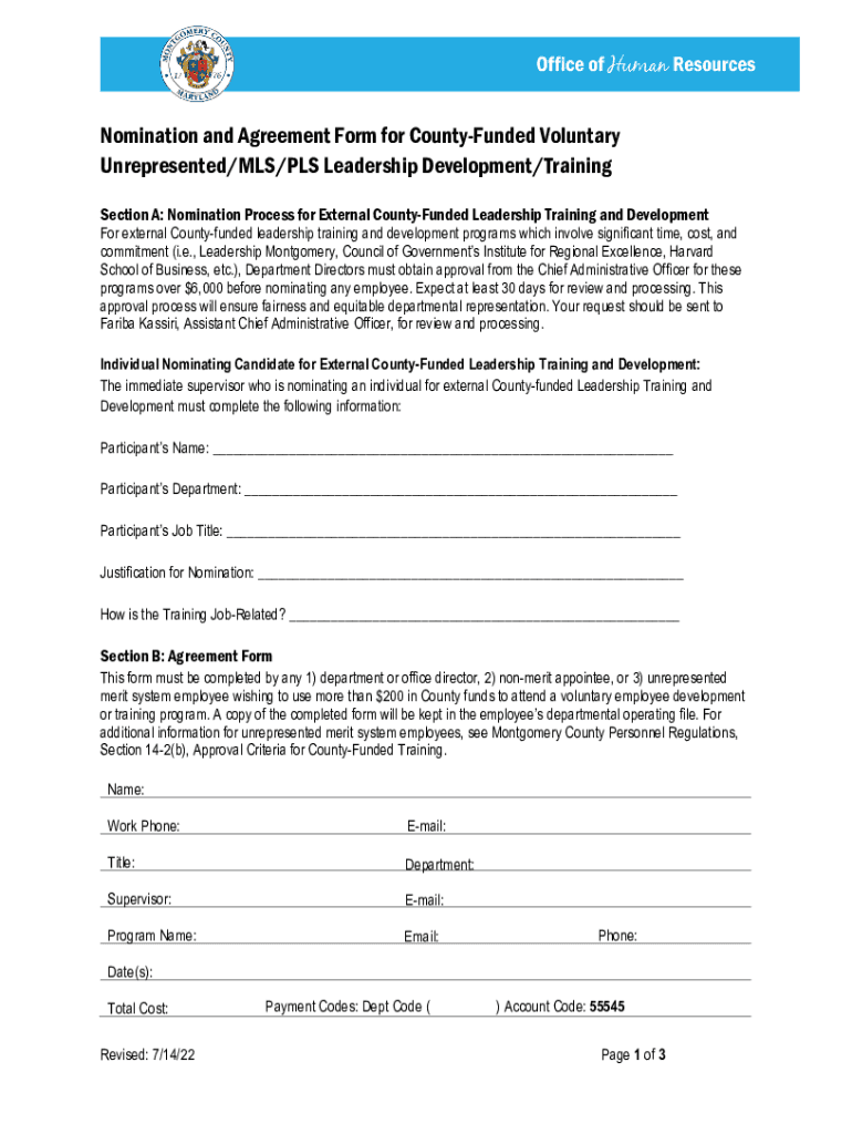 Nomination and Agreement Form for CountyFunded Voluntary Unrepresented/MLS/PLS Leadership Development/Training Section A: Nomination Process for External CountyFunded Leadership Training and Development