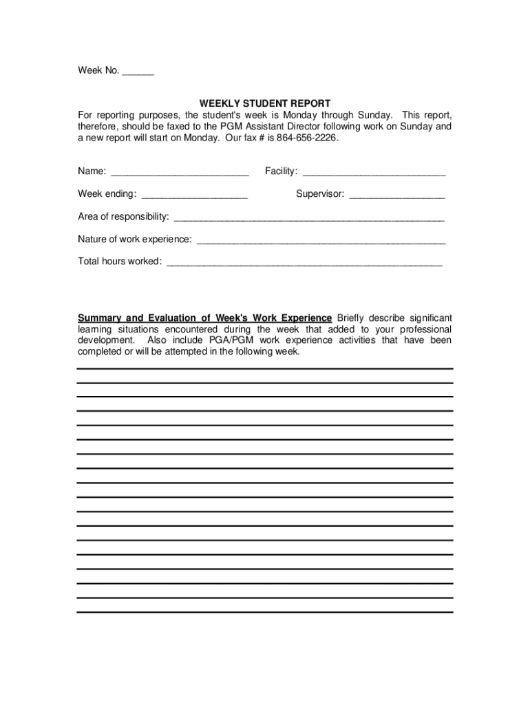 Week No. ___WEEKLY STUDENT REPORT For reporting purposes, the student\'s week is Monday through Sunday. This report, therefore, should be faxed to the PGM Assistant Director following work on Sunday