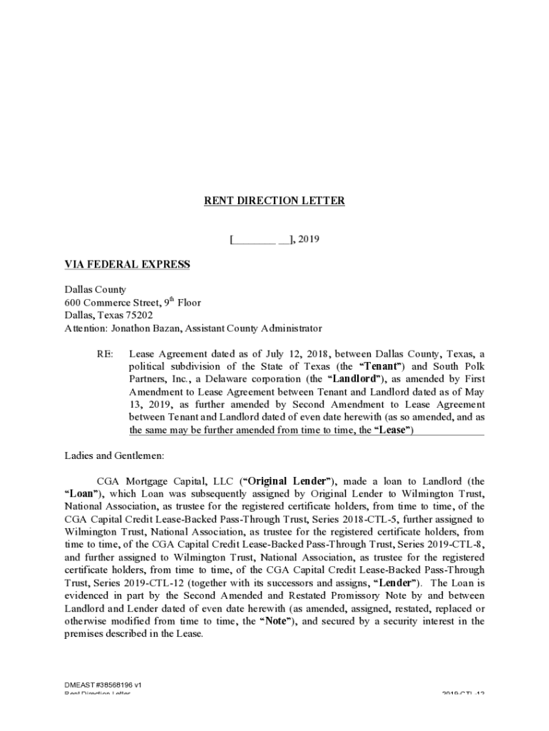 RENT DIRECTION LETTER [___ __], 2019 VIA FEDERAL EXPRESS Dallas County 600 Commerce Street, 9th Floor Dallas, Texas 75202 Attention: Jonathon Kazan, Assistant County Administrator RE:Lease Agreement