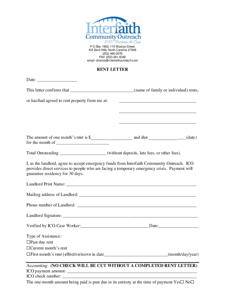 P O Box 1663, 115 Fustian Street Kill Devil Hills, North Carolina 27948 (252) 4800070 FAX (252) 2616342 email: director@interfaithoutreach.comRENT LETTER Date: ___ This letter confirms that ___(name