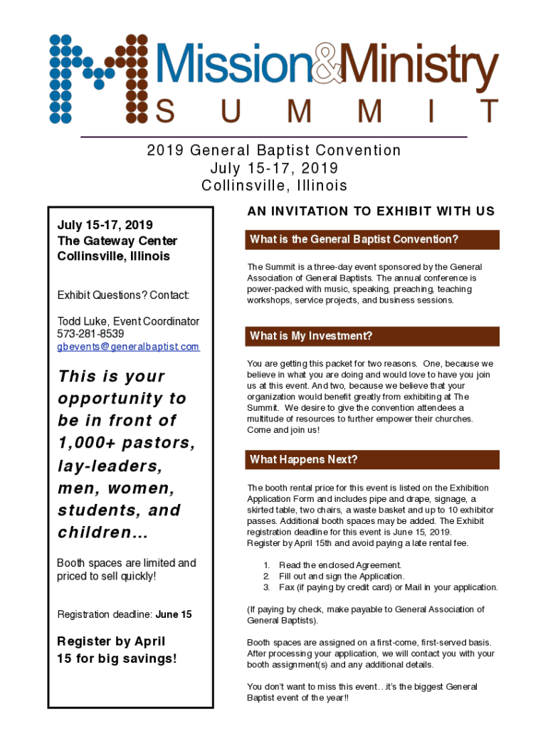 2 0 1 9 G e n e r an l B a p t i s t C o n v e n t i o n July 15 17, 201 9 Collinsville, Illinois AN INVITATION TO EXHIBIT WITH US July 1517, 2019 The Gateway Center Collinsville, Illinois Exhibit