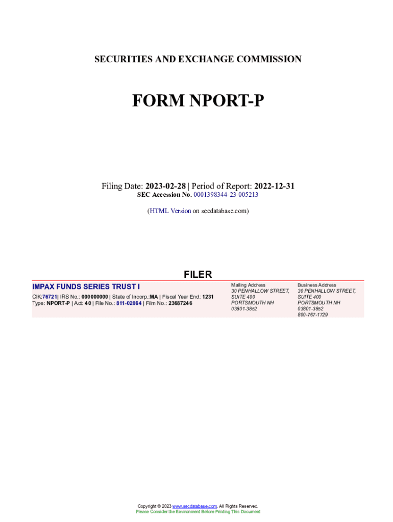 Get the free IMPAX FUNDS SERIES TRUST I Form NPORT-P Filed 2023-02-28. Accession Number