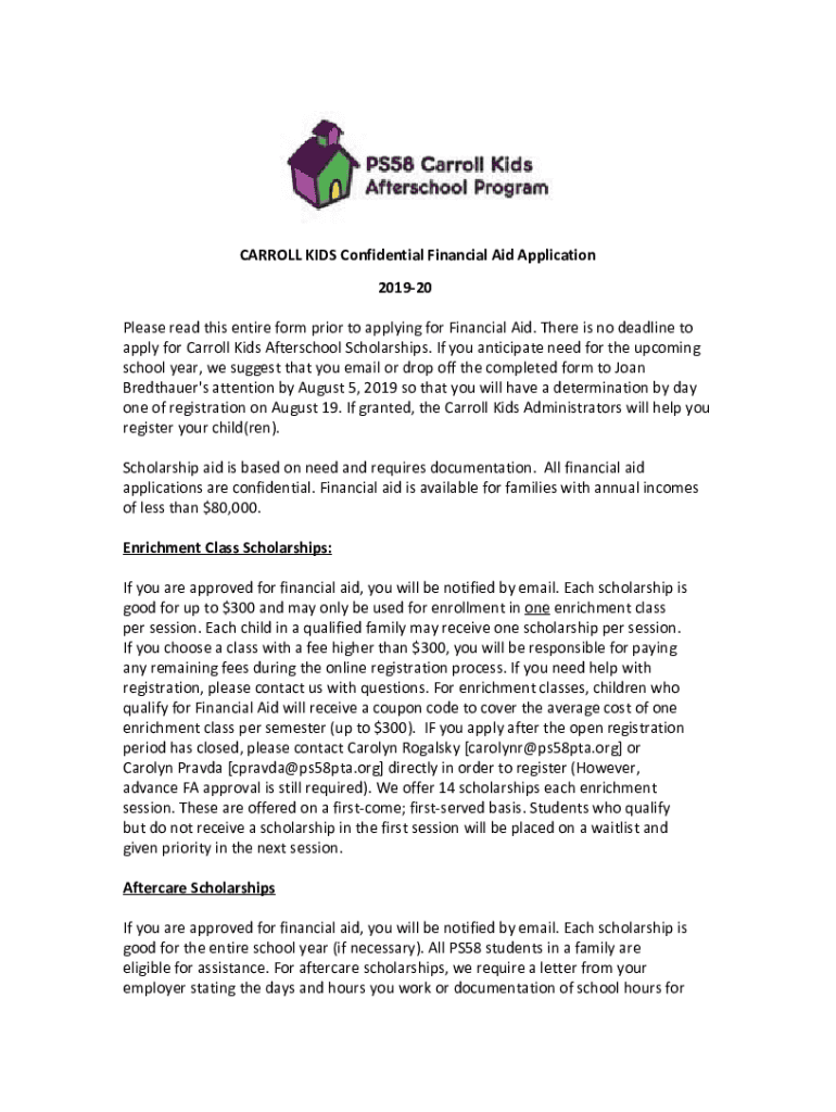CARROLL KIDS Confidential Financial Aid Application 201920 Please read this entire form prior to applying for Financial Aid. There is no deadline to apply for Carroll Kids After school Scholarships.