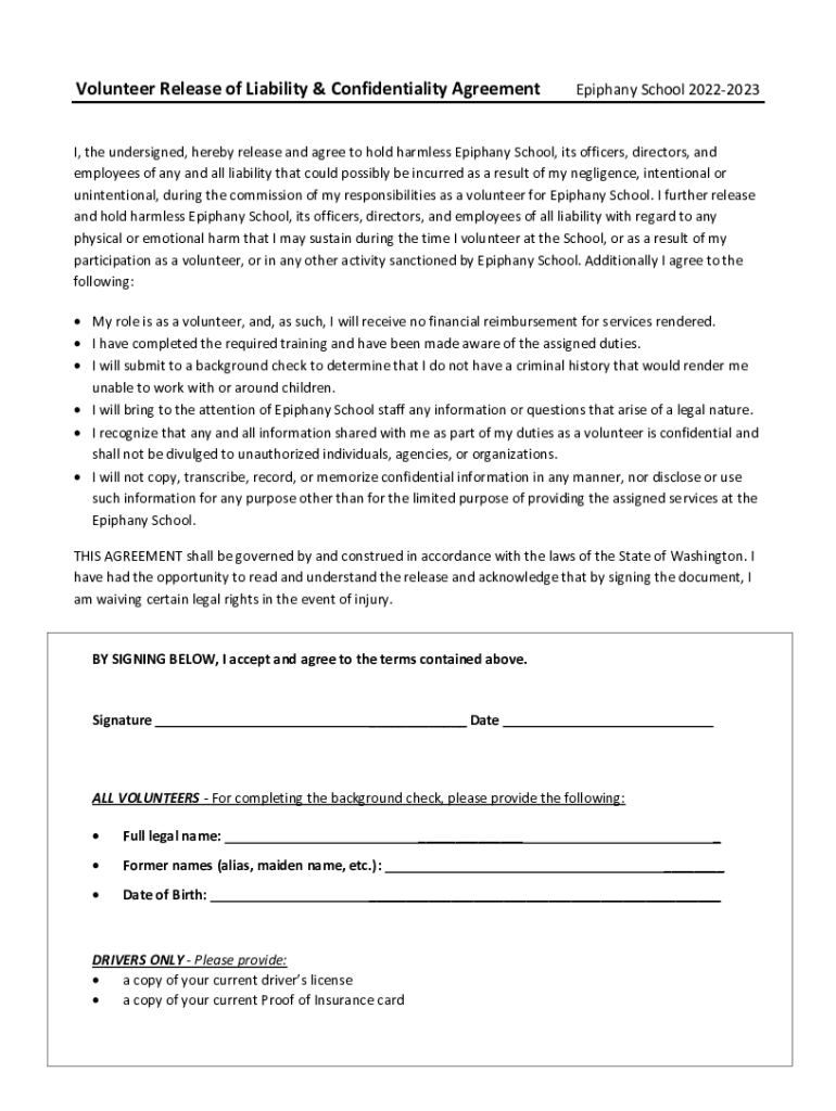 Volunteer Release of Liability & Confidentiality Agreement Epiphany School 20222023I, the undersigned, hereby release and agree to hold harmless Epiphany School, its officers, directors, and employees