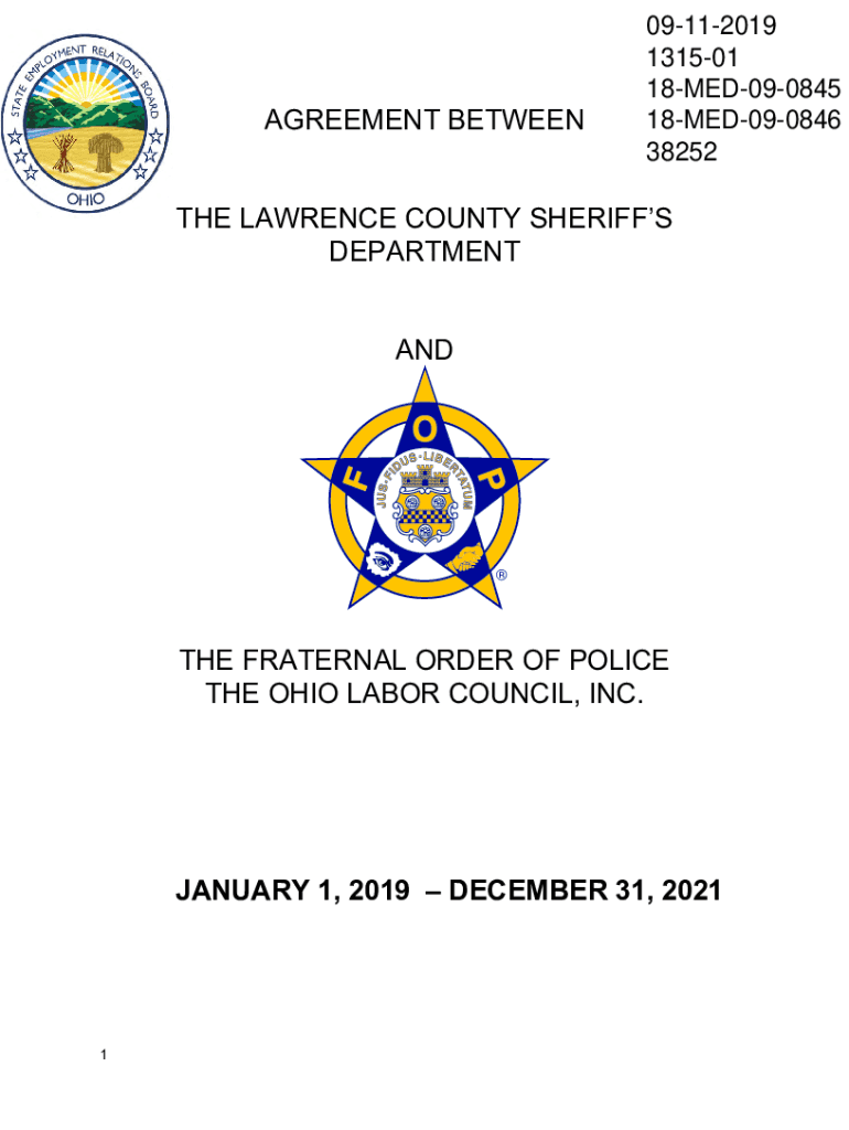 AGREEMENT BETWEEN09112019 131501 18MED090845 18MED090846 38252THE LAWRENCE COUNTY SHERIFFS DEPARTMENT ANOTHER FRATERNAL ORDER OF POLICE THE OHIO LABOR COUNCIL, INC.JANUARY 1, 2019, DECEMBER 31, 20211TABLE