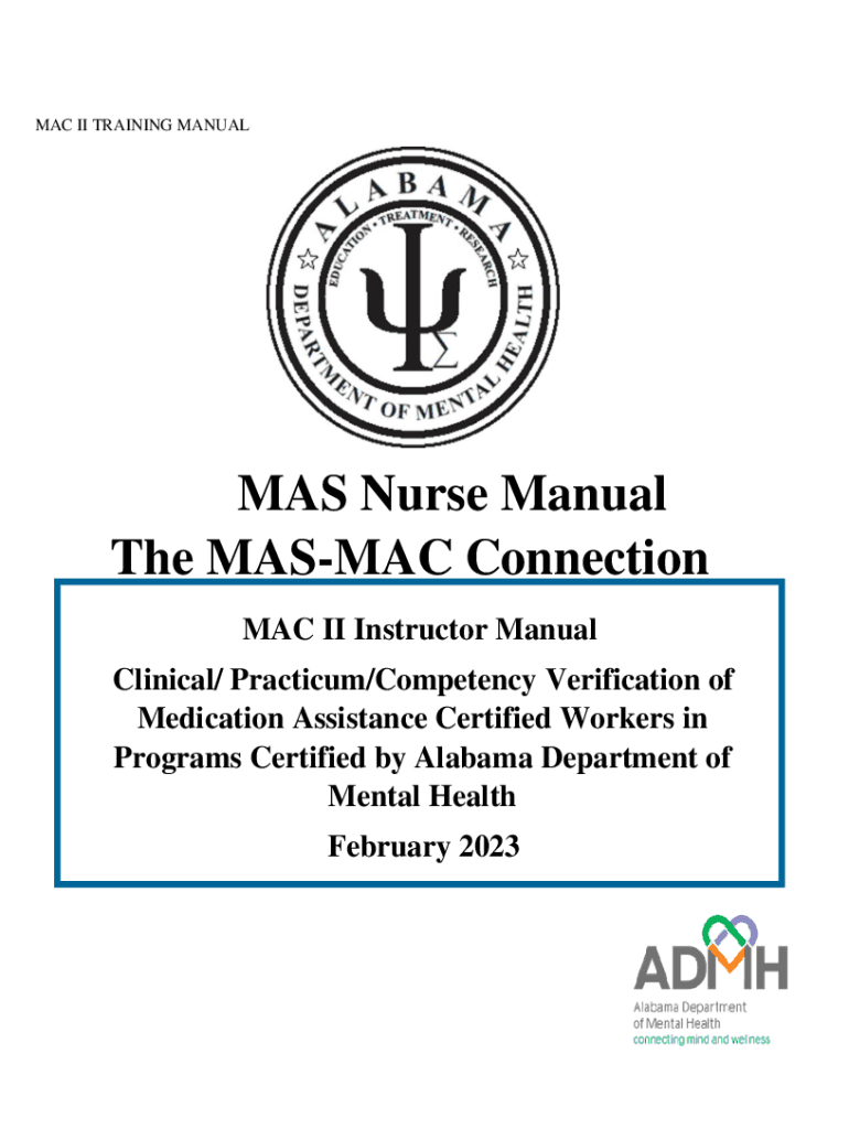 MAC II TRAINING MANUAL MAS Nurse Manual The MASMAC Connection MAC II Instructor Manual Clinical/ Practicum/Competency Verification of Medication Assistance Certified Workers in Programs Certified