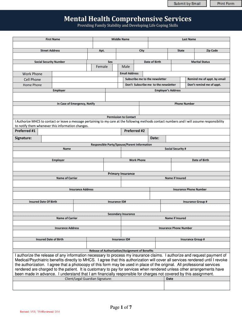 Submit by Email Print Form Mental Health Comprehensive Services Providing Family Stability and Developing Life Coping Skills First Name Middle Name Street Address Apt. Last Name City Social Security