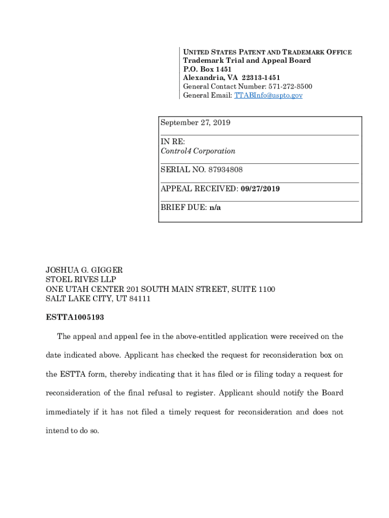 UNITED STATES PATENT AND TRADEMARK OFFICE Trademark Trial and Appeal Board P.O. Box 1451 Alexandria, VA 223131451 General Contact Number: 5712728500 General Email: TTABInfo@uspto.govSeptember 27,
