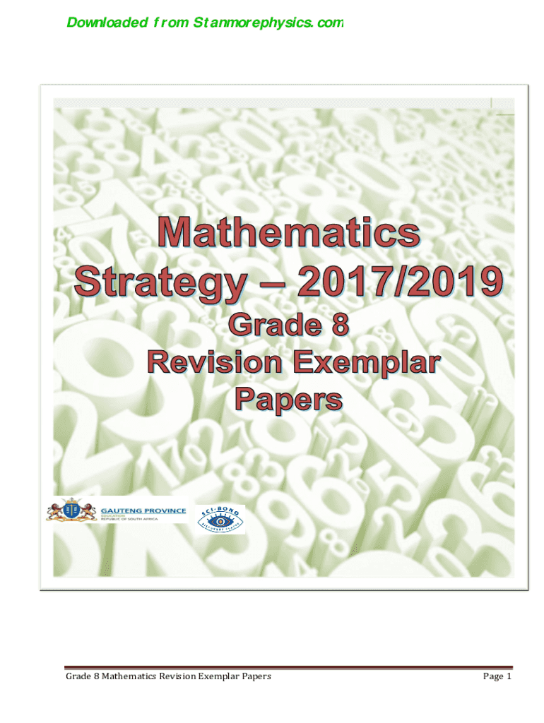 Downloaded from Stanmorephysics. Comrade 8 Mathematics Revision Exemplar Papers Page 1TABLE OF CONTENTS Pg No.1.1Grade 8 Examination Exemplars 131.2Grade 8 Examination Exemplar 1 Memo192.1Grade 8