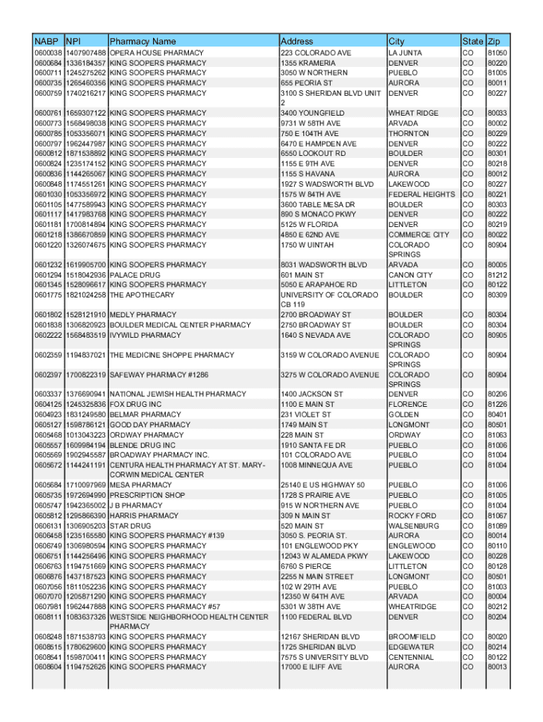 NABP Pharmacy NameAddressCityState Zip0600038 0600684 0600711 0600735 06007591407907488 1336184357 1245275262 1265460356 1740216217OPERA HOUSE PHARMACY KING COOPERS PHARMACY KING COOPERS PHARMACY