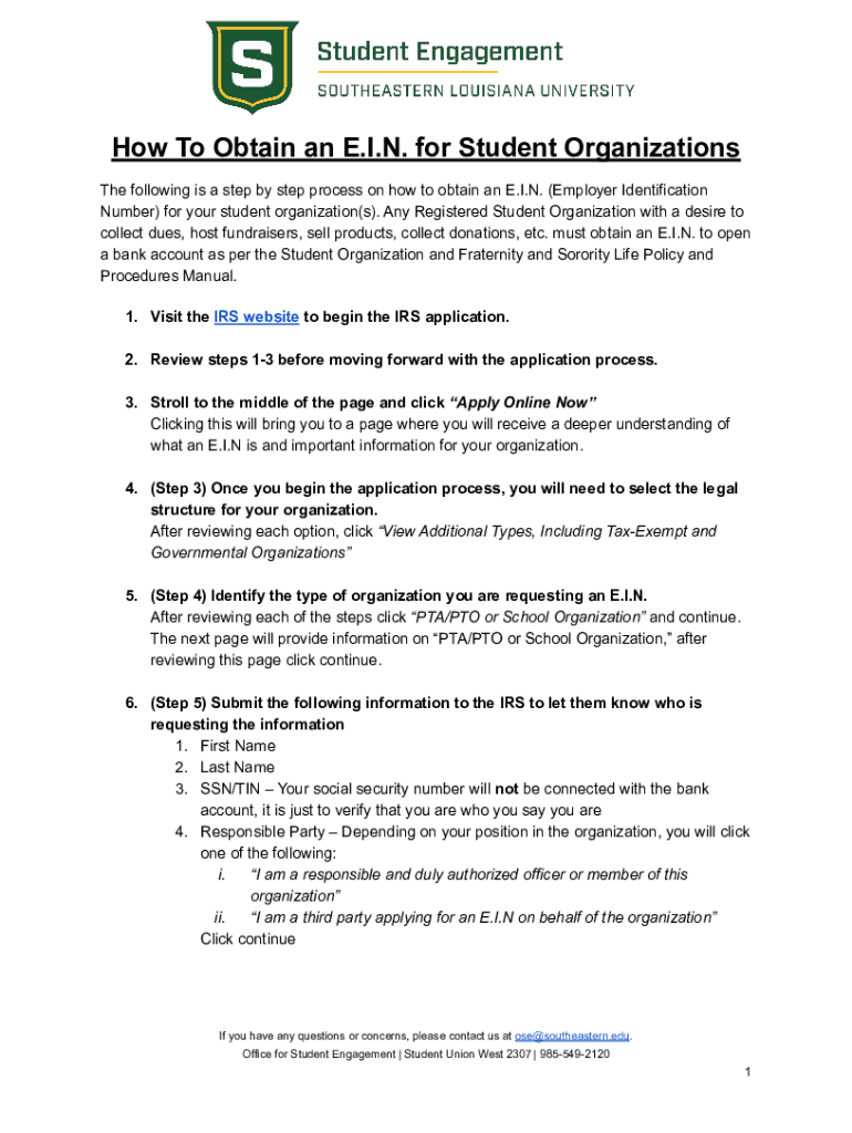 How To Obtain an E.I.N. for Student Organizations The following is a step-by-step process on how to obtain an E.I.N. (Employer Identification Number) for your student organization(s). Any Registered