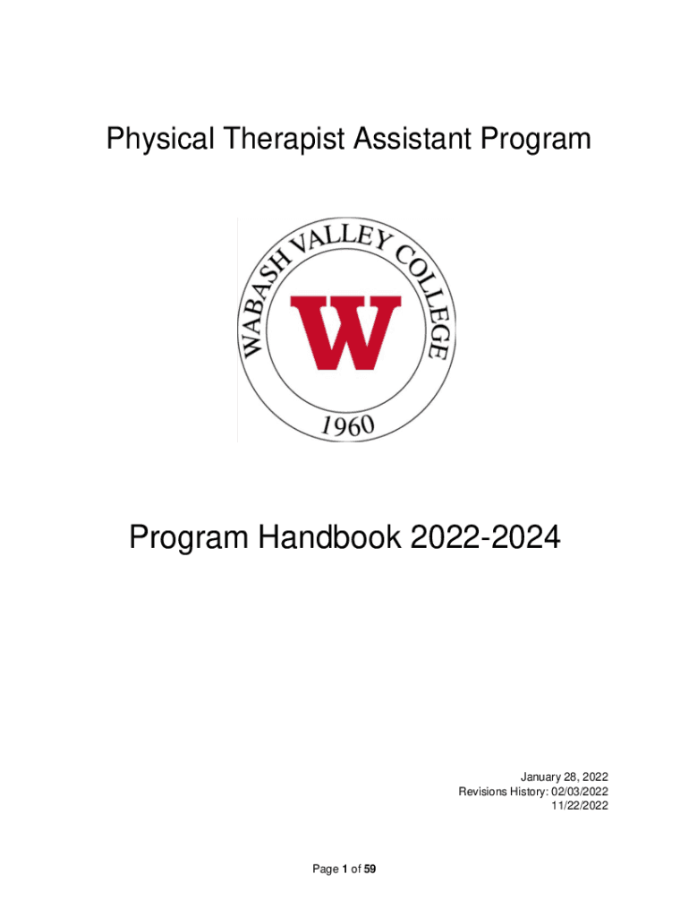 Physical Therapist Assistant ProgramProgram Handbook 20222024January 28, 2022 Revisions History: 02/03/2022 11/22/2022Page 1 of 59Table of Contents WELCOME AND INTRODUCTION ..............................................................................................................