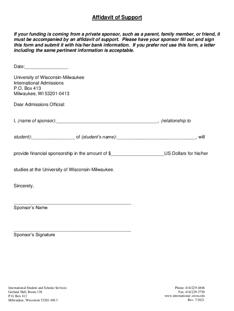 Affidavit of Support If your funding is coming from a private sponsor, such as a parent, family member, or friend, it must be accompanied by an affidavit of support. Please have your sponsor fill