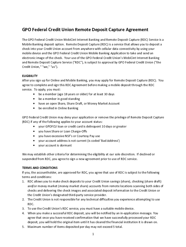 GPO Federal Credit Union Remote Deposit Capture Agreement The GPO Federal Credit Union Medicine Internet Banking and Remote Deposit Capture (RDC) Service is a Mobile Banking deposit option. Remote