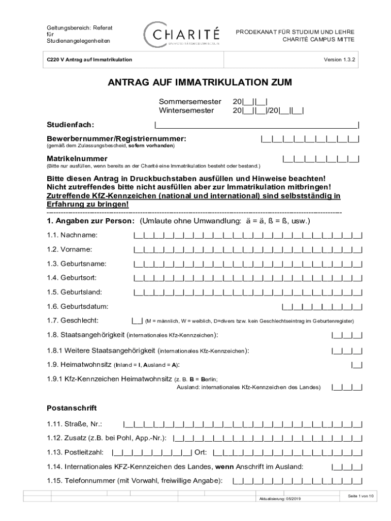 Charted CAMPUS MITTEC220 V Ant rag AUF ImmatrikulationVersion 1.3.2ANTRAG AUF MATRICULATION SUM