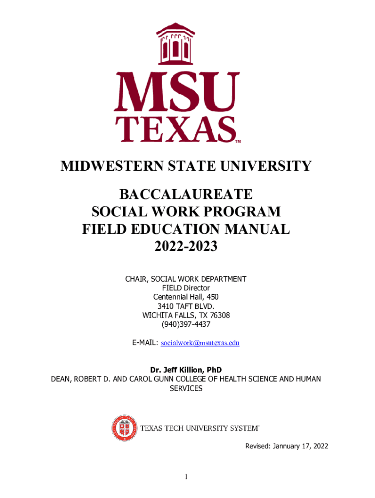 MIDWESTERN STATE UNIVERSITY BACCALAUREATE SOCIAL WORK PROGRAM FIELD EDUCATION MANUAL 20222023 CHAIR, SOCIAL WORK DEPARTMENT FIELD Director Centennial Hall, 450 3410 TAFT BLVD. WICHITA FALLS, TX 76308