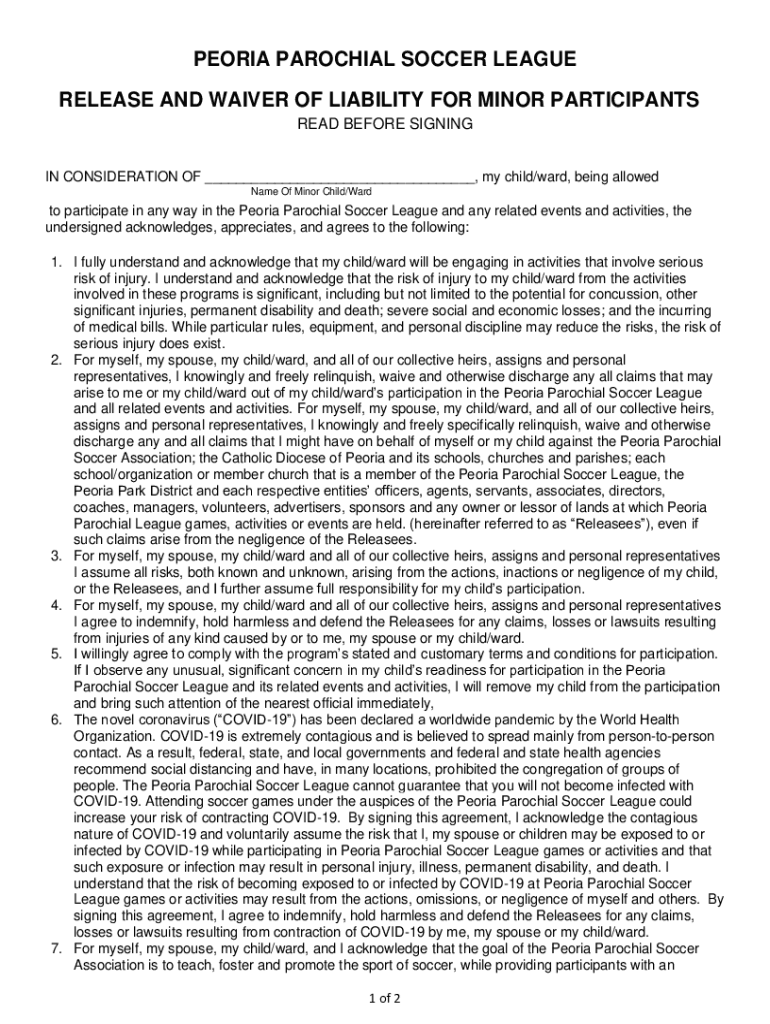 PEORIA PAROCHIAL SOCCER LEAGUE RELEASE AND WAIVER OF LIABILITY FOR MINOR PARTICIPANTS READ BEFORE SIGNING IN CONSIDERATION OF ___, my child/ward, being allowed Name Of Minor Child/Weirdo participate